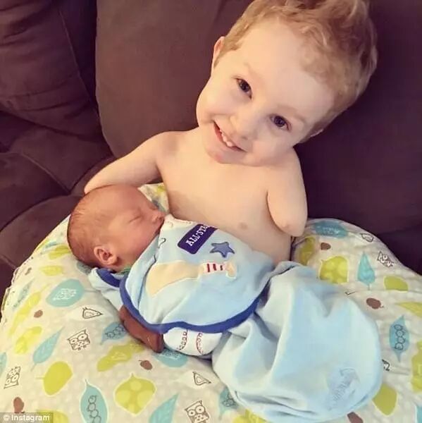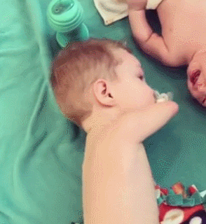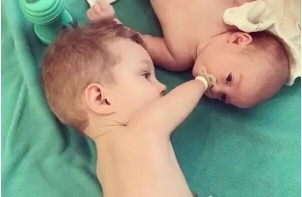 這個機智的小哥哥見狀后便快速設(shè)法挪動到弟弟身邊去,靠著臉部和僅有的上臂部分成功地舉起了奶嘴,并將它塞回到了弟弟嘴里。