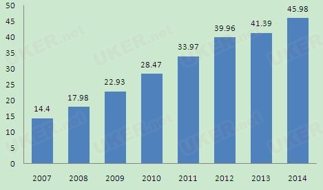 圖表:2007-2014年我國出國留學人數(shù)增長情況(單位:萬人)